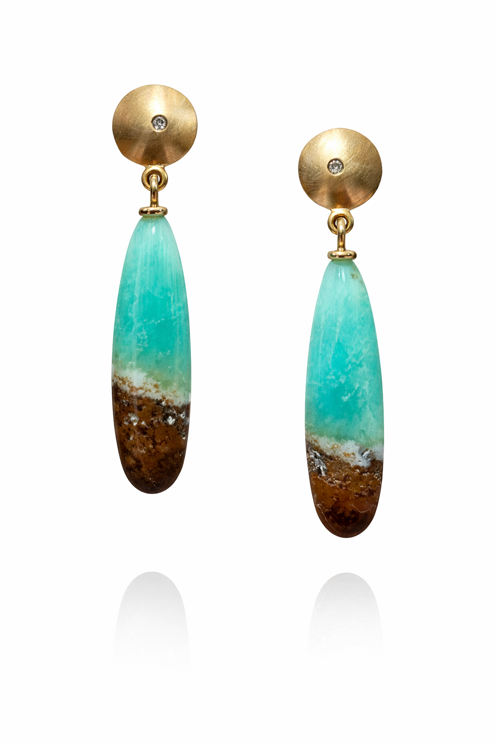 Stud earrings, chrysoprase with mother rock, diamonds, 18k yellow gold