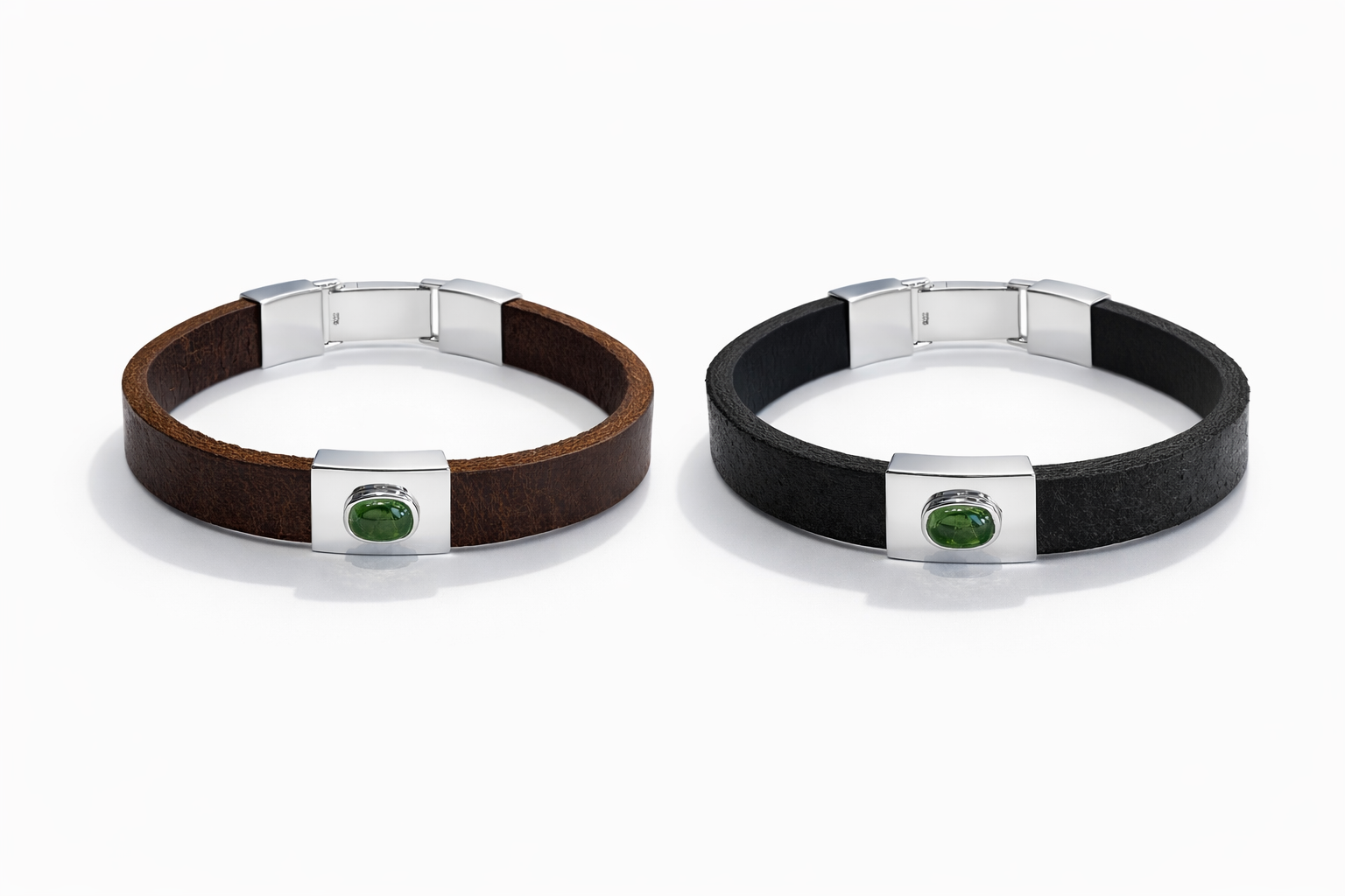 Armband aus Leder mit Silber Teil und gefasstem grüner Turmalin, 1.5 ct.
