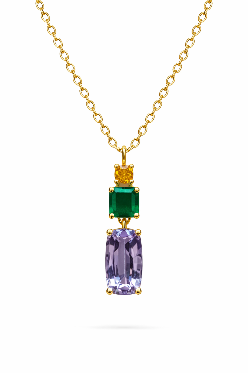 Collier Three Stones; Saphir violett, Smaragd, fancy Diamant; 750/- Gelbgold
