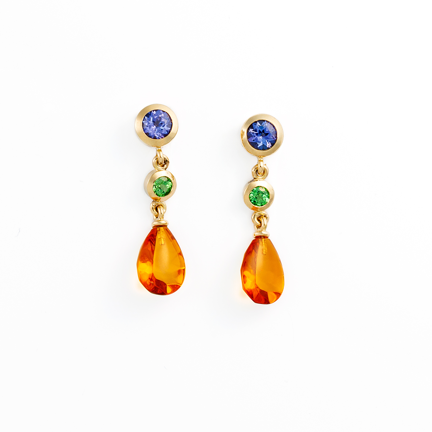 Ohrstecker Capri, Tansanit, Tsavorit, Bernstein facettiert, 750/- Gelbgold